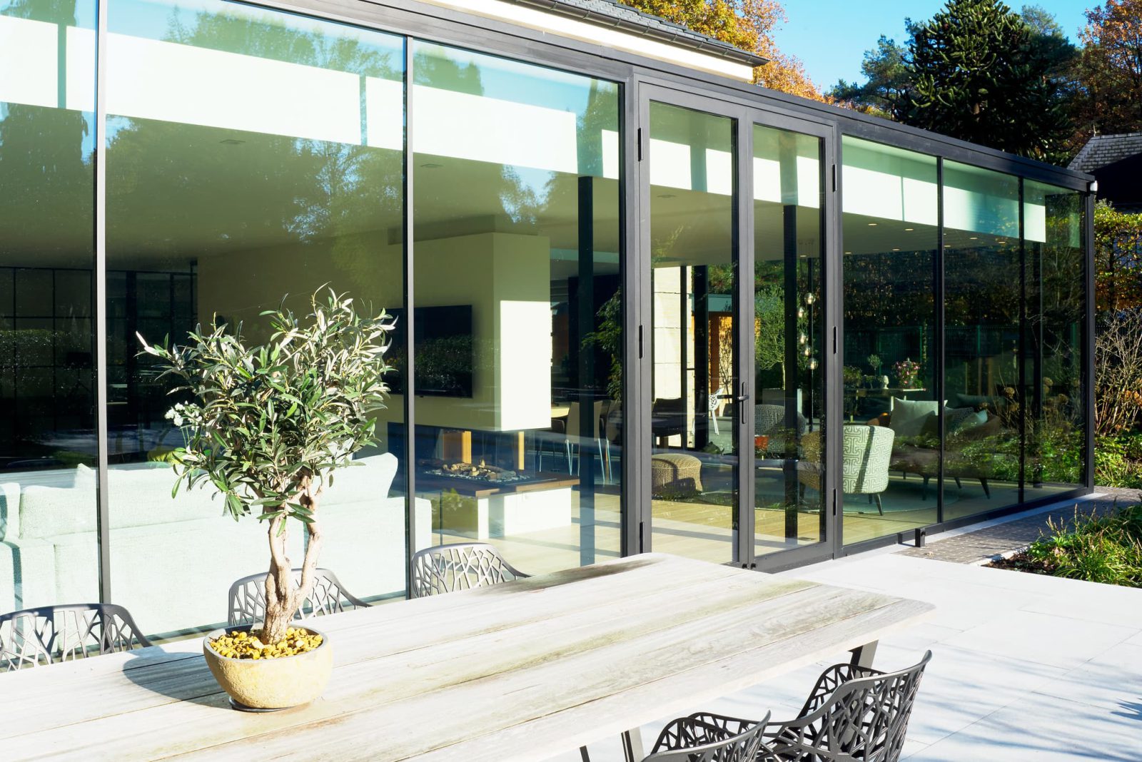 Aluminium leefveranda met hoge stalen deuren: rijkelijk ruimtegevoel