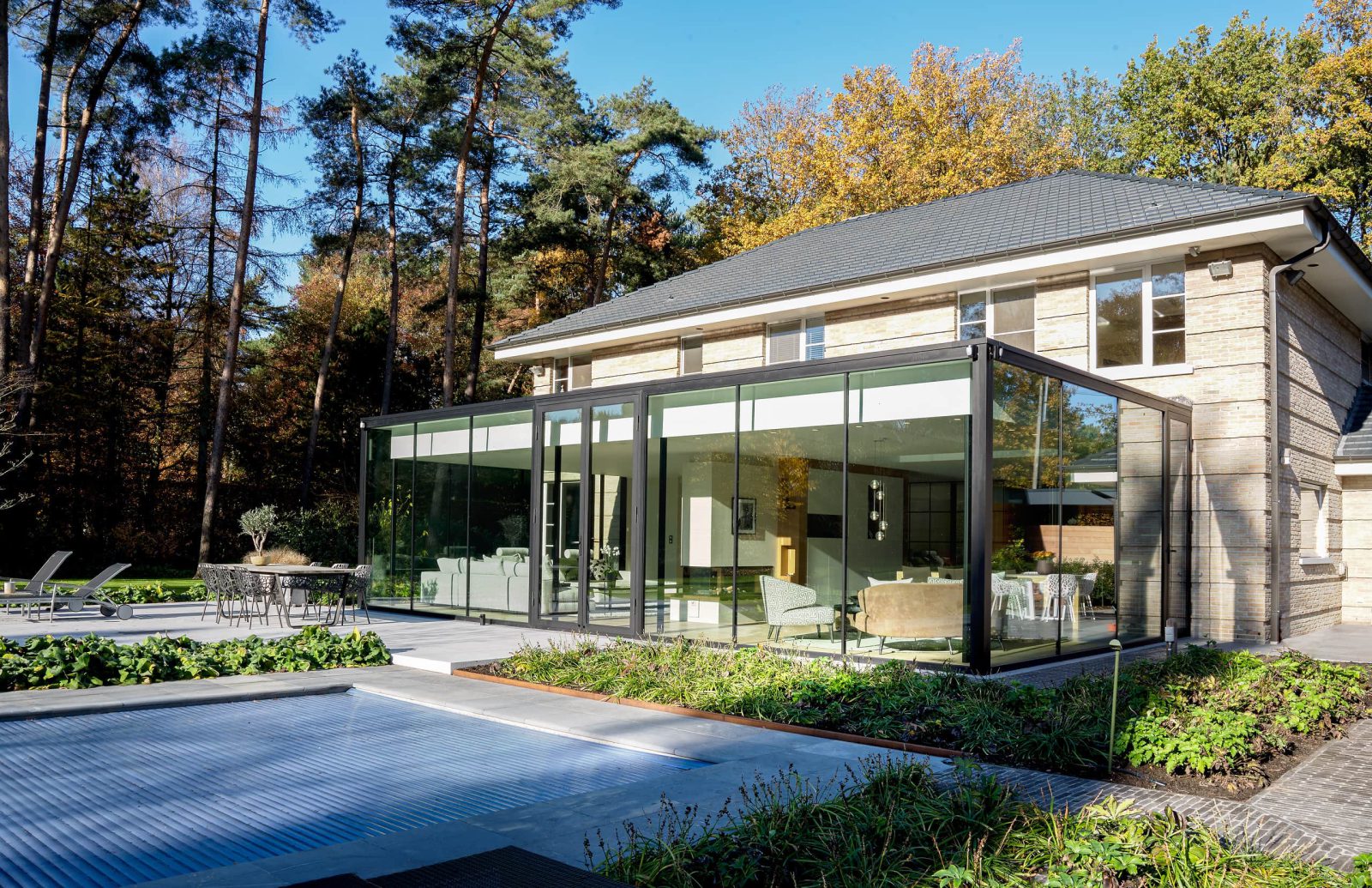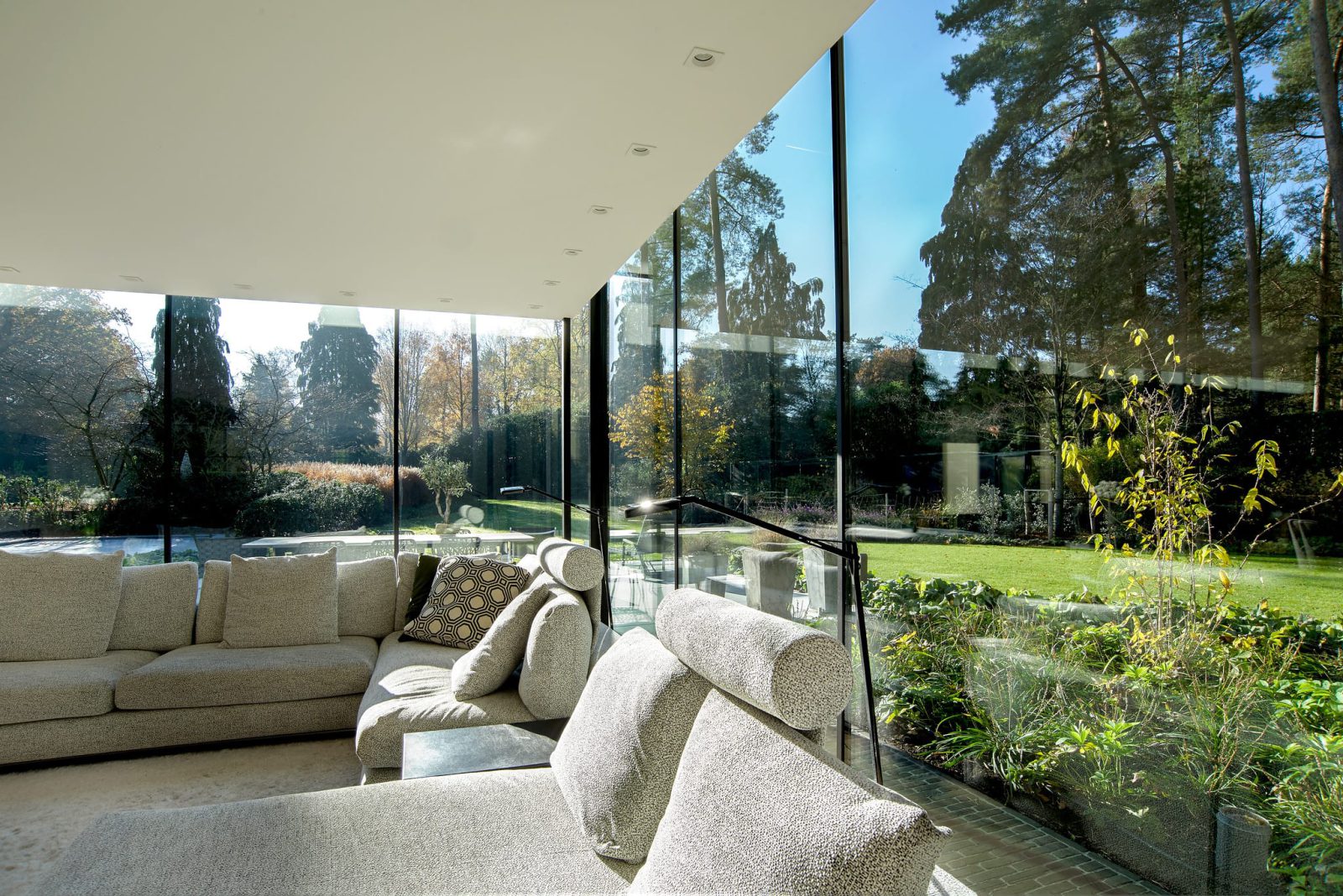 Om het zicht naar buiten te maximaliseren, kozen we voor hoge raampartijen van drie meter. We werkten met een aluminium constructie met fijne profielen en een slanke dakrand.